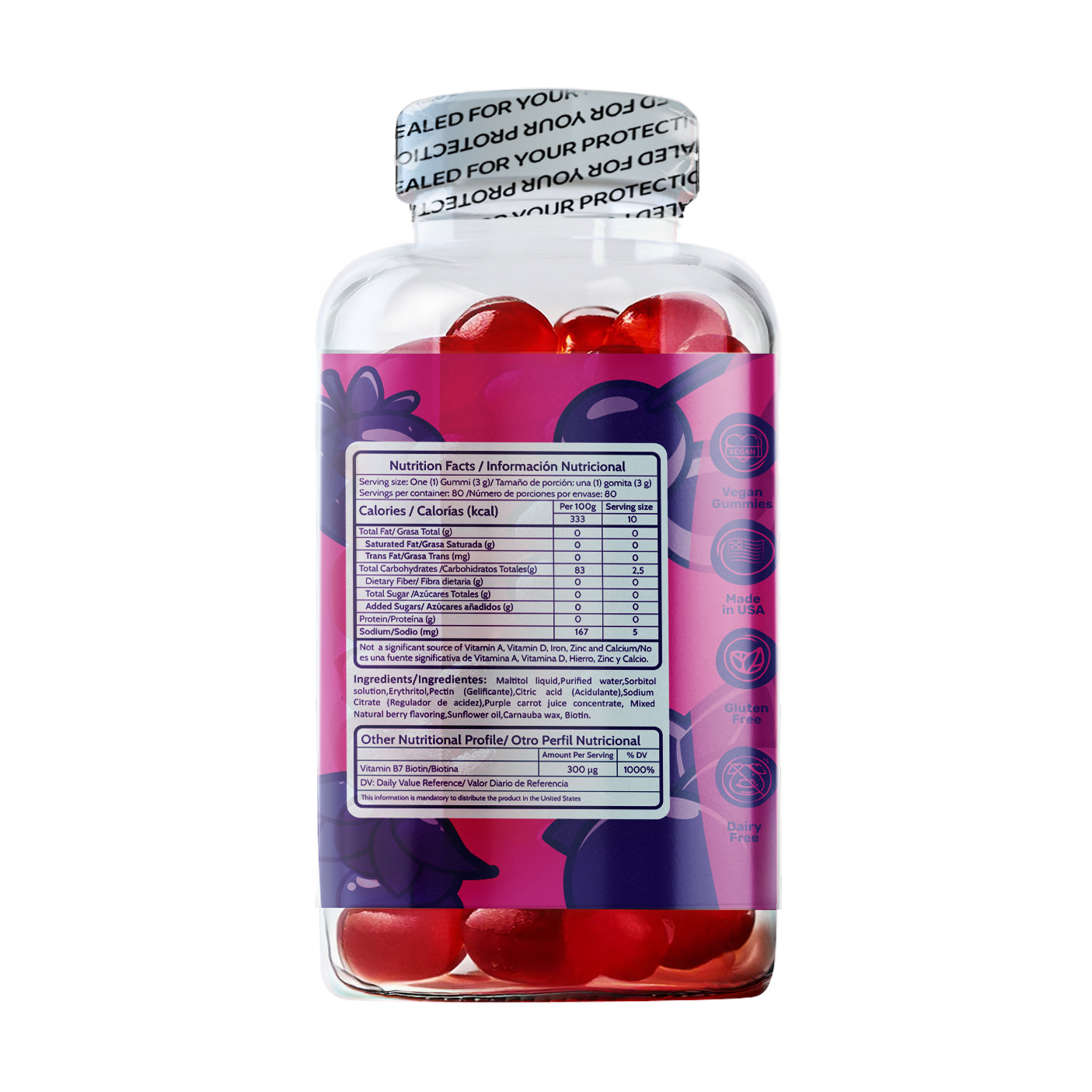 Al ser esencial para el metabolismo celular, las gomitas de biotina ayudan a mantener una piel saludable promoviendo la renovación celular y la producción de ácidos grasos saludables. Esto resulta en una piel más hidratada, elástica y con mejor aspecto.
